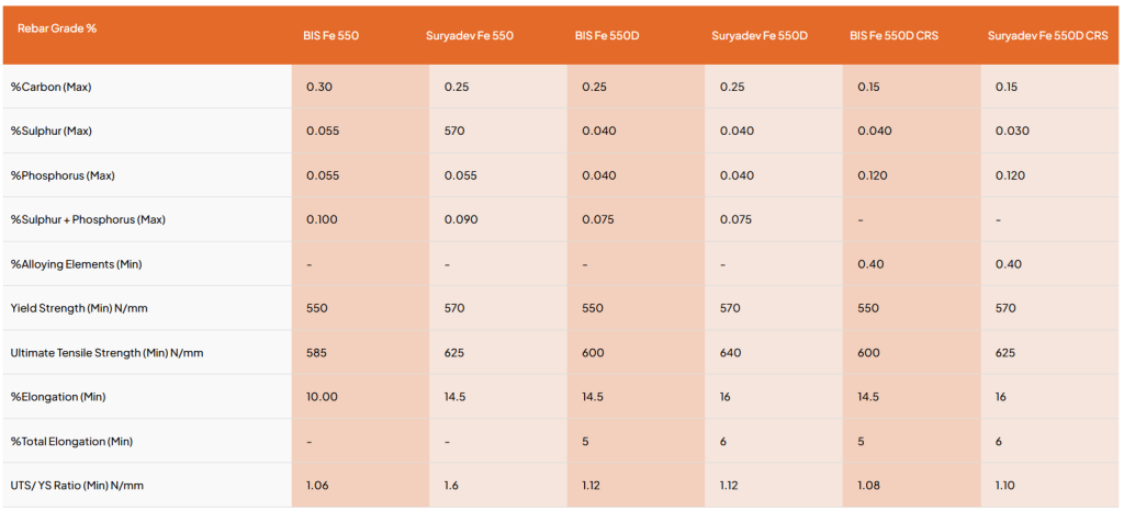 | Rebar Grade % | BIS FE 550 | Suryadev Fe 550 | BIS Fe 550D | Suryadev Fe 550D | BIS Fe 550D CRS | Suryadev Fe 550D CRS |